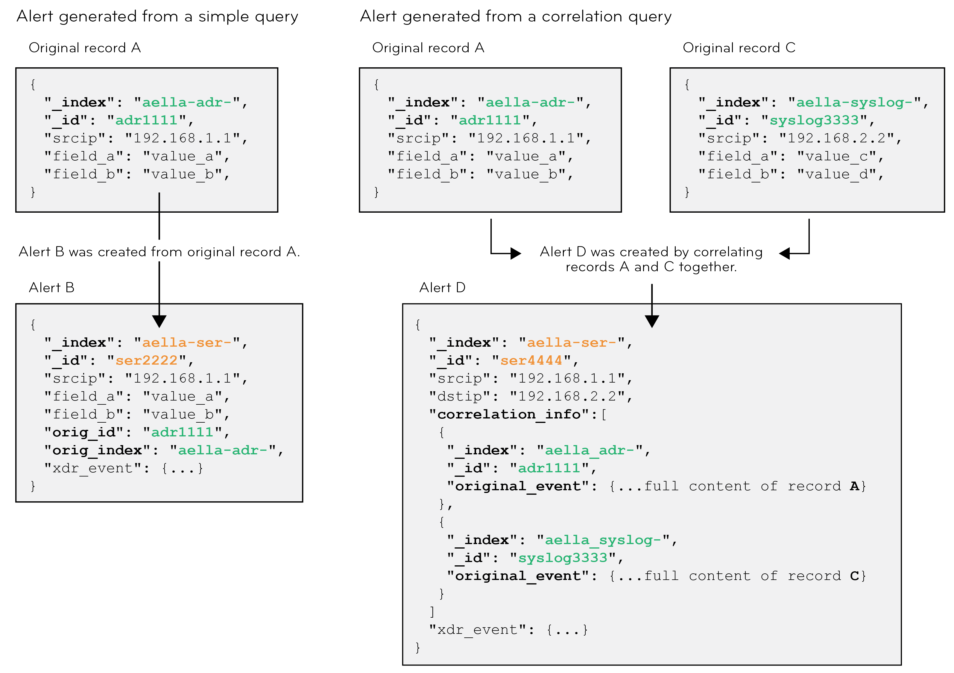 • In both cases, the alert record provides a reference to the _id value of the records of the original events that triggered the alert.