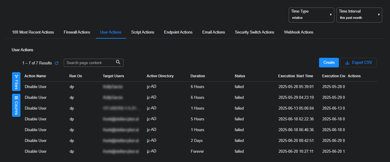 The Automation | Action History | User Actions tab displays the user actions taken by Stellar Cyber. If a user is disabled manually from the Event Display or automatically by Automated Threat Hunting, that action appears here.