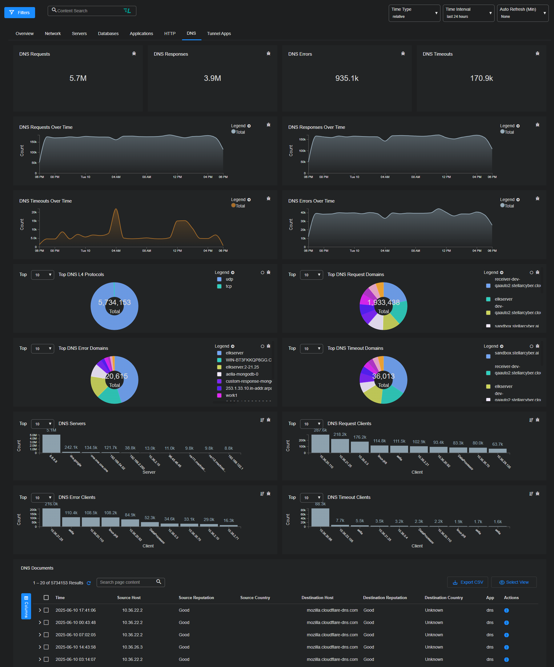 Observing network traffic patterns is a basic technique for detecting all kinds of network problems, including security breaches. In the process of collecting data to find anomalies, Stellar Cyber accumulates a massive amount of information about the networks for which it has sensors. The Dashboards | PREDEFINED | Network Visibility page makes this information easily accessible. The top of the dashboard provides a tab menu that is used to select the display composition, as shown below:
