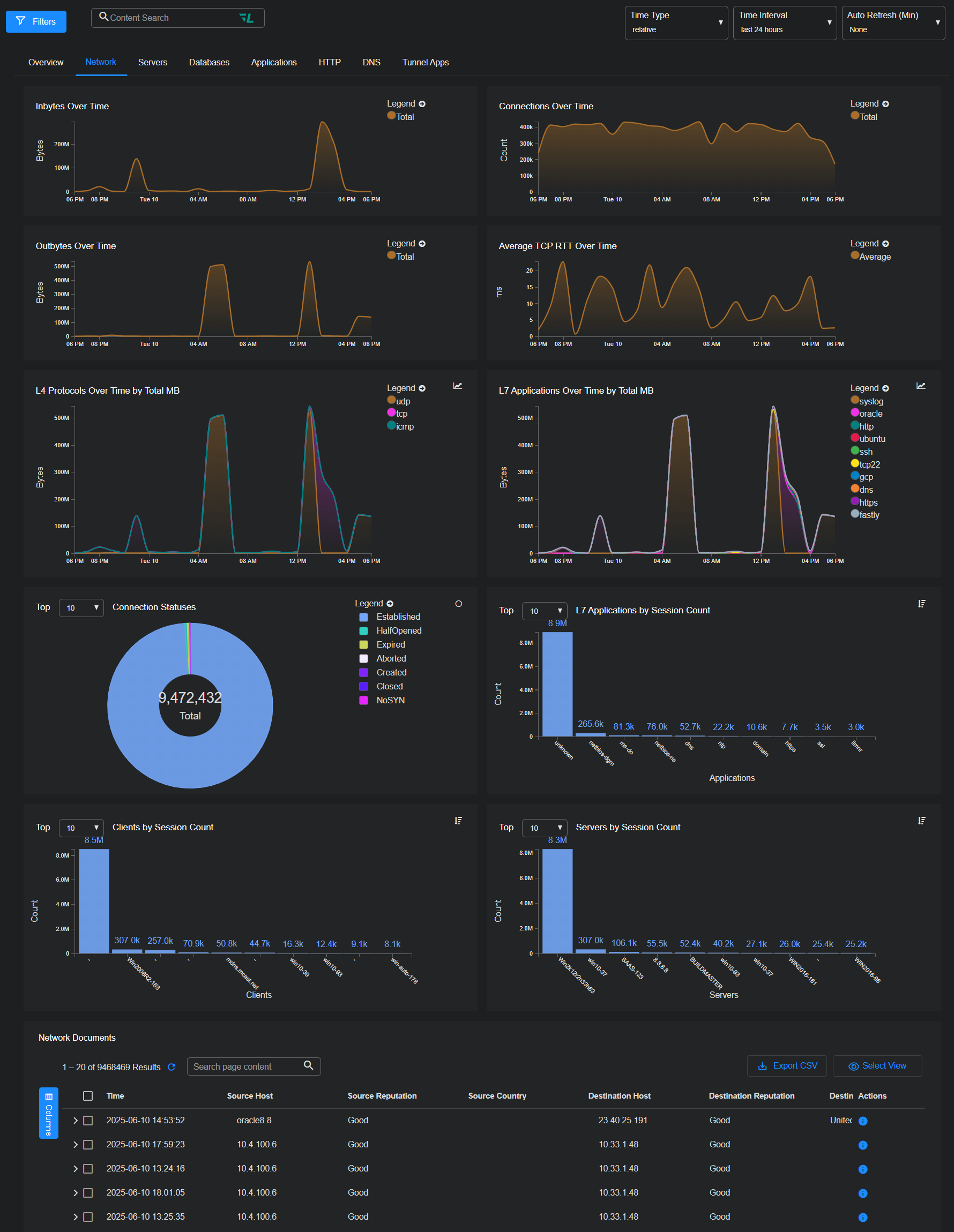 The Network display focuses on distilling data observed from network traffic information. A sample of this display is shown in the following image.