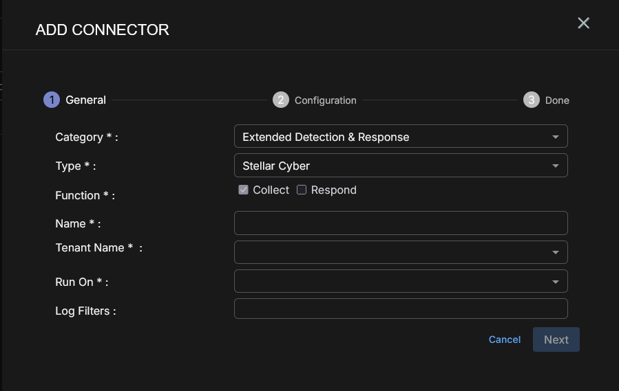 Stellar Cyber conducts a basic connectivity test for the connector and reports a success or failure result. A successful test indicates that you entered all of the connector information correctly.