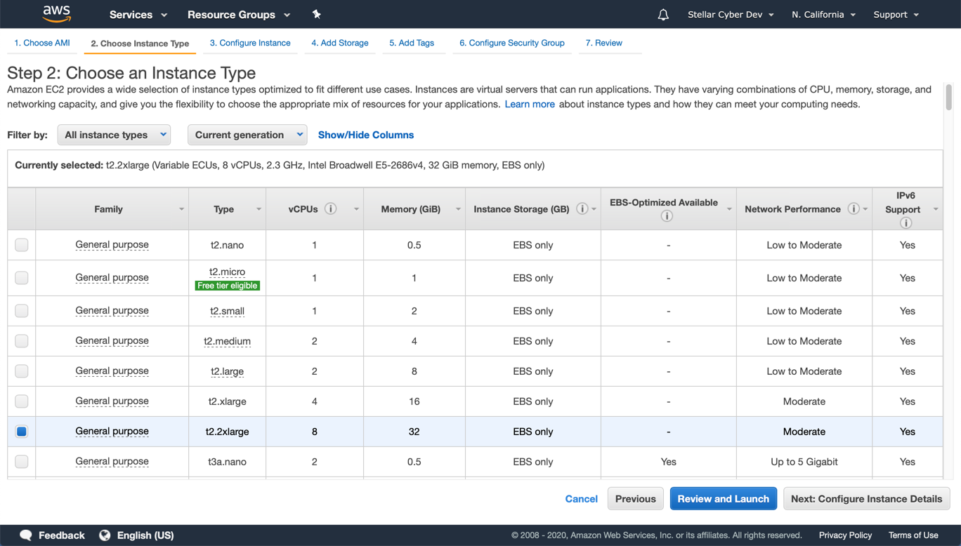 - Choose a t2.2xlarge or higher type. Smaller instance types are not supported.