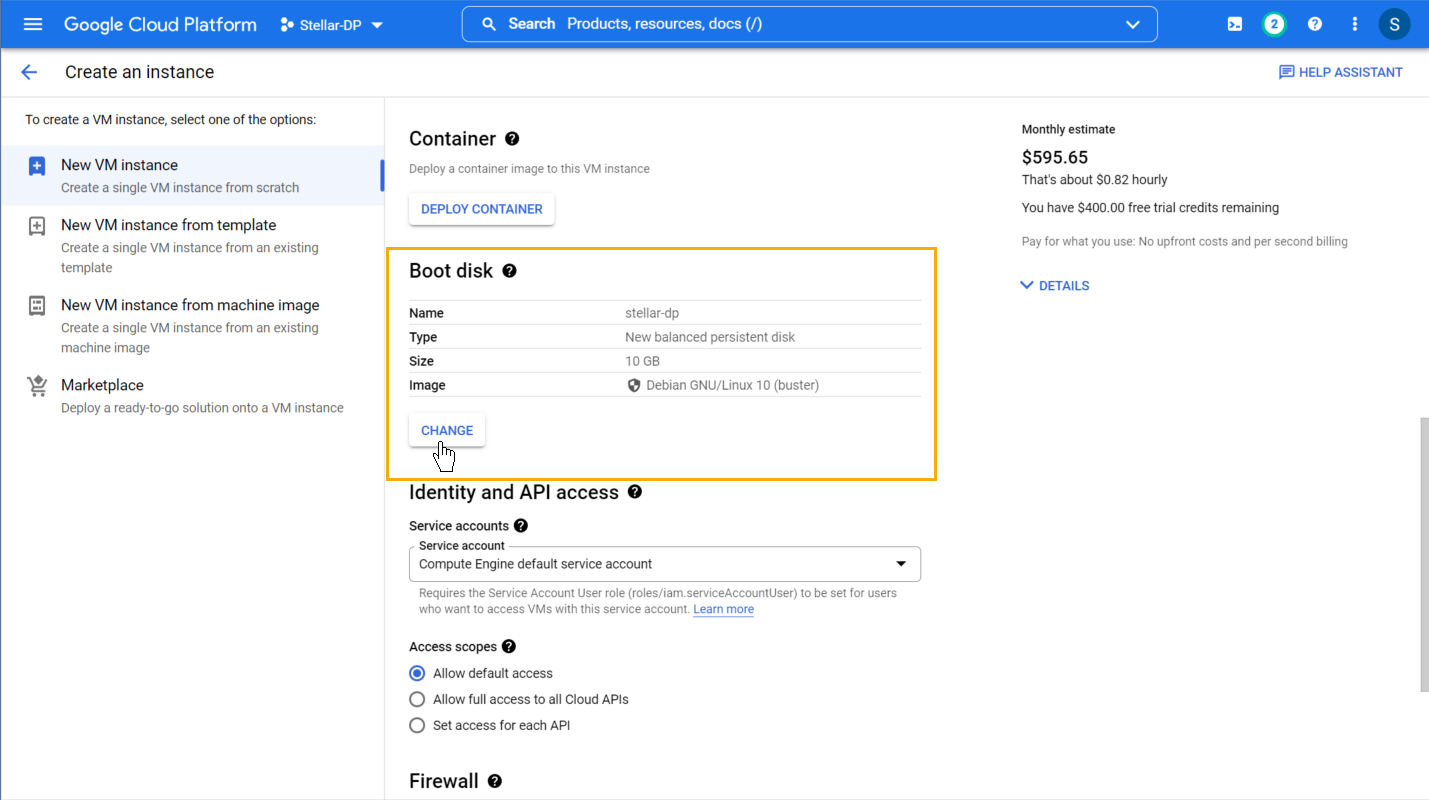 Scroll down to the Boot disk section and click the CHANGE button.
