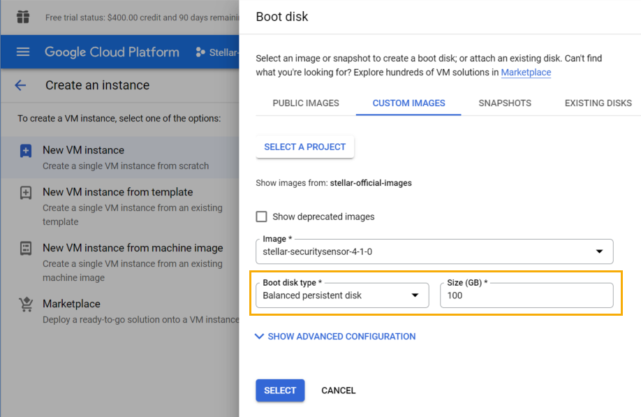 Set the Boot disk type to Balanced persistent disk, choose a size of 100 GB, and click Select.