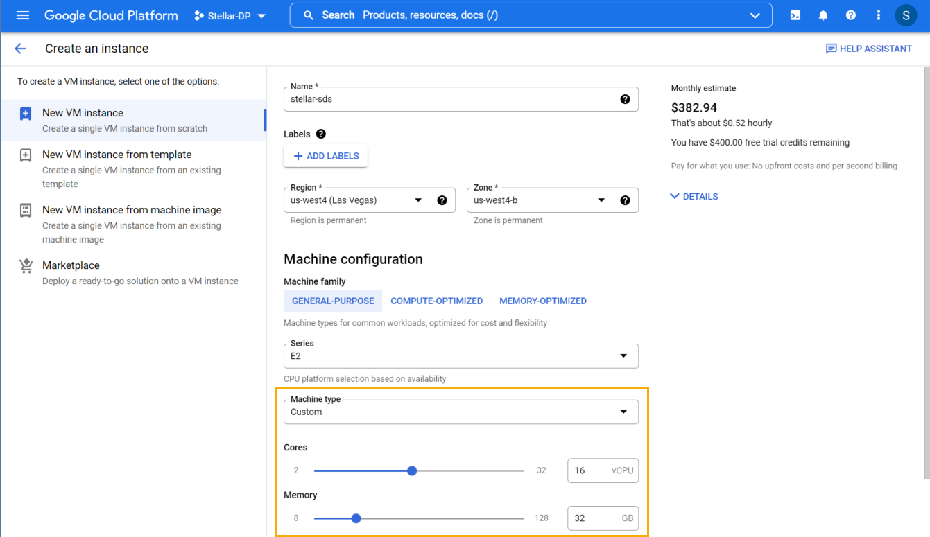 Choose a Machine type for the instance. You can either choose one of the preconfigured GCP machine types or create a Custom machine type, so long as the instance meets the minimum specifications.