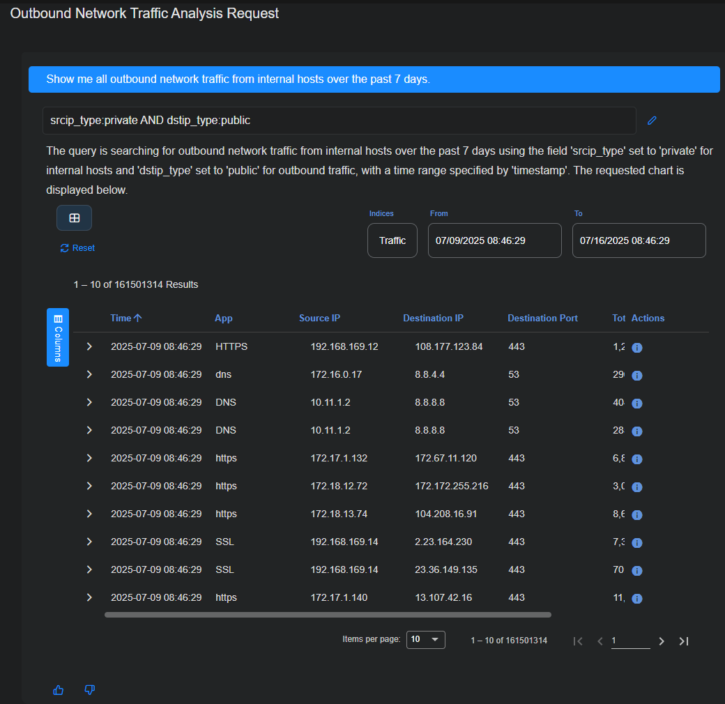 In this example, the outbound traffic dataset revealed multiple connections from internal source IP addresses to external destinations, some over standard protocols such as HTTPS, DNS, and SSL. While this list is comprehensive, it serves as a foundation for identifying unusual patterns—such as unexpected applications, high traffic volumes, or repeated contact with unfamiliar IP addresses—that warrant further inspection.