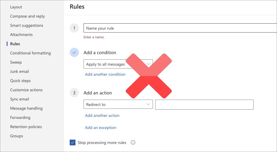 Inbox Rule (Redirect): Check that you’re not using the redirect method. It resends the original message with most of the original headers and adds an extra Received hop. Stellar Cyber doesn’t support this method either because the header doesn’t identify the corporate entity. As a result, Stellar Cyber cannot associate the email with the proper tenant.