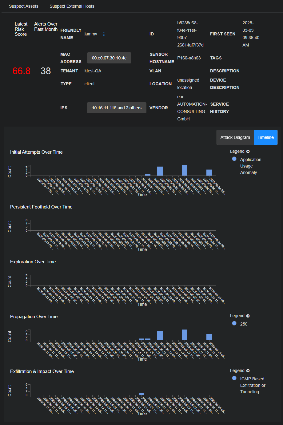 • Timeline – Each stage of the XDR Kill Chain has its own time-series graph of alerts that involve this host. Each alert type is assigned its own color and mentioned in the legend.