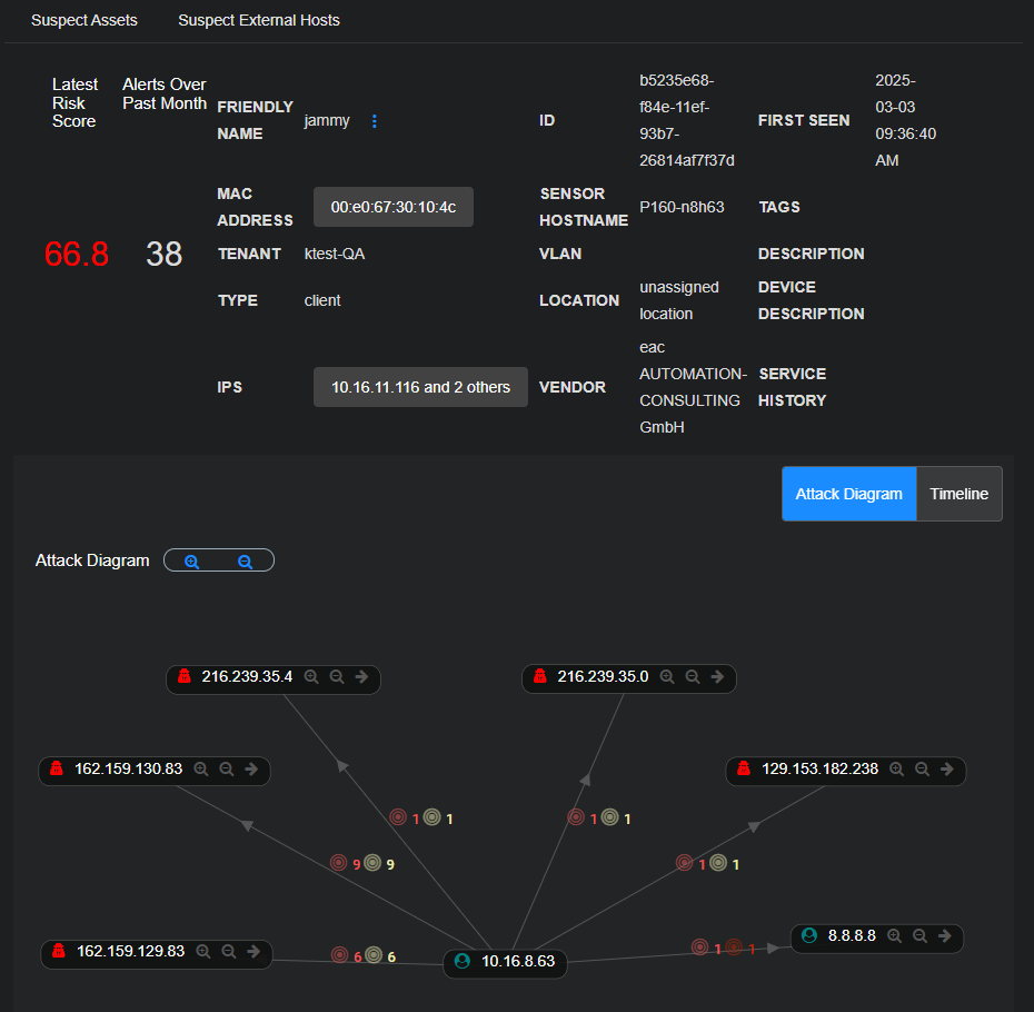 • Attack Diagram – This appears to the right of the Kill Chain Time Sequence. It provides a connection chart that lists all (or as many as possible) hosts that are interacting with the currently selected host. The colored dots on the connection lines represent the detectors that identified the information.