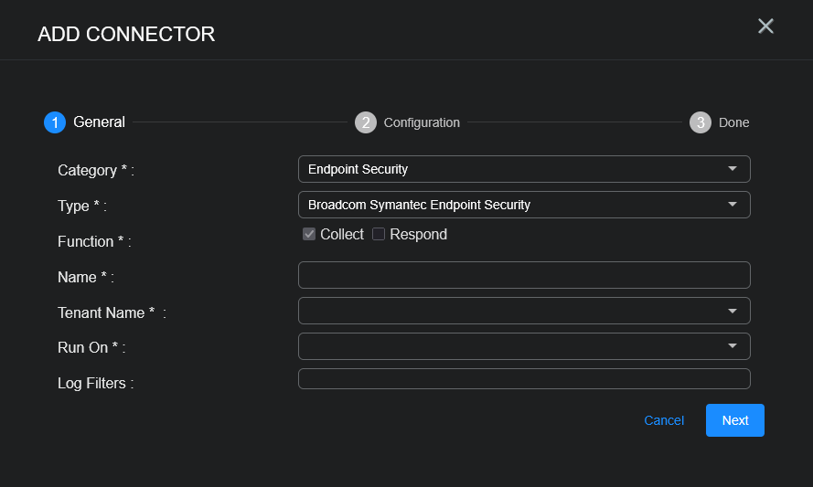 This connector requires the Broadcom Symantec Endpoint Security Enterprise subscription, except for Incidents, which requires the Broadcom Symantec Endpoint Security Complete subscription.![]()