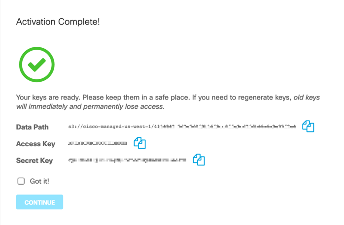 6. Click Continue. Your storage is activated, and an activation screen appears. Copy the Access Key and Secret Key to a safe location.