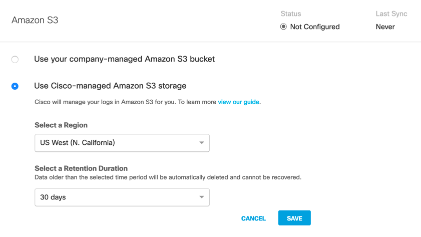 2. If Cisco Umbrella owns the bucket, select Use Cisco-managed Amazon S3 storage, select a region and retention duration.