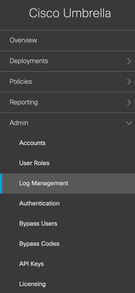 There are two options to configure Cisco Umbrella log management. Follow the guidance in the Cisco Umbrella documentation to Enable Logging to Your Own S3 Bucket or Enable Logging to a Cisco-managed S3 Bucket.