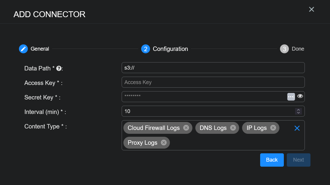 With the data path and keys ready, you can add a Cisco Umbrella connector in Stellar Cyber: