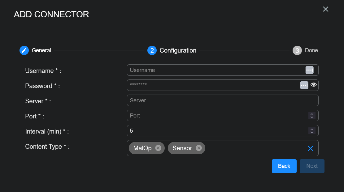 Choose the Content Type. The logs for MalOp and Sensor are supported.