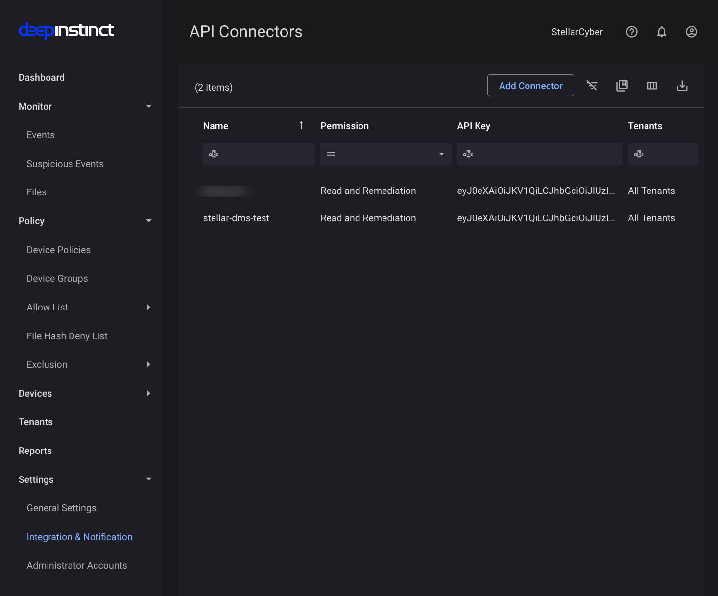 Log into your Deep Instinct Dashboard as an administrative user. Make note of the fully qualified domain name portion of the URL you used to log in (e.g., just mycompany.customer.deepinstinct.com). You will need this when you configure the Stellar Cyber connector.