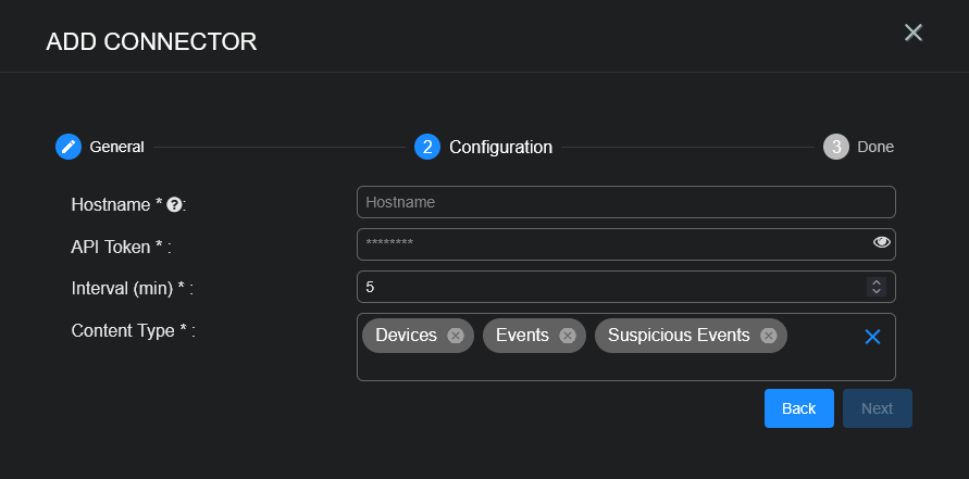 Choose the Content Type. The logs for Devices, Events, and Suspicious Events are supported.