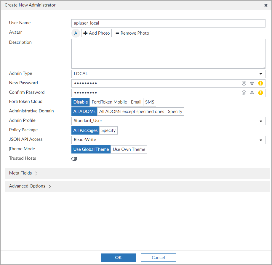 To create a local API user, follow the guidance in the Fortinet documentation for Creating administrators.