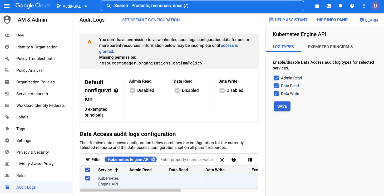Audit Logs for the service account must have Admin Read, Data Read, and Data Write enabled for the Kubernetes Engine API or for Google Cloud Storage.