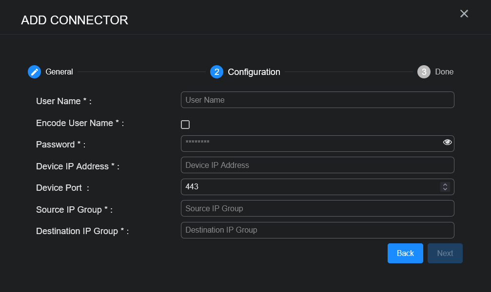 https://<Device IP Address>:<Device Port> where <Device IP Address> and <Device Port> are variables from the configuration of this connector |