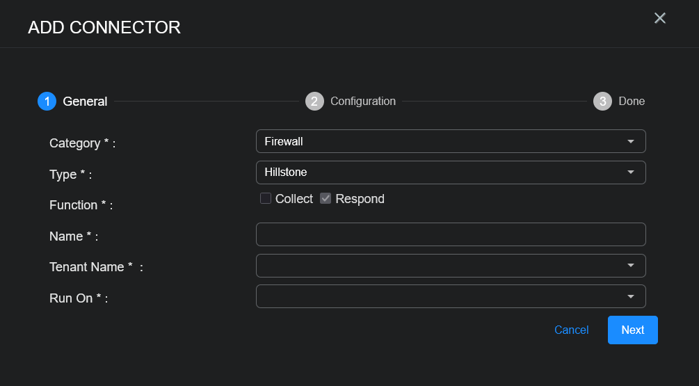 To add a new Hillstone firewall connector in Stellar Cyber: