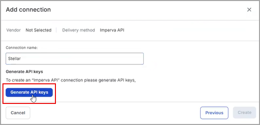 In the Add connection page, enter a Connection name and click Generate API keys.