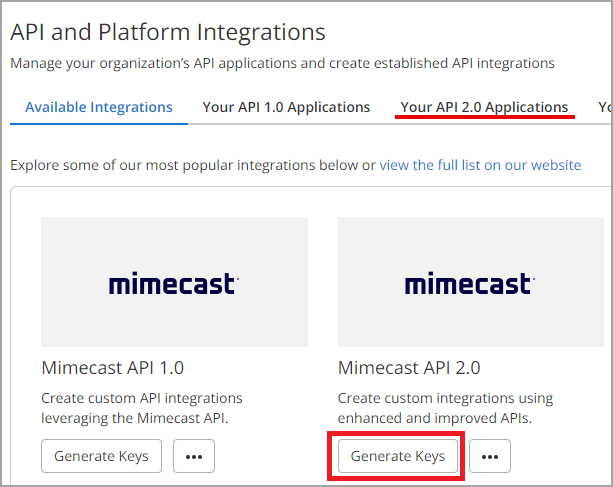 2. Navigate to Your API 2.0 Applications and click Generate Keys.