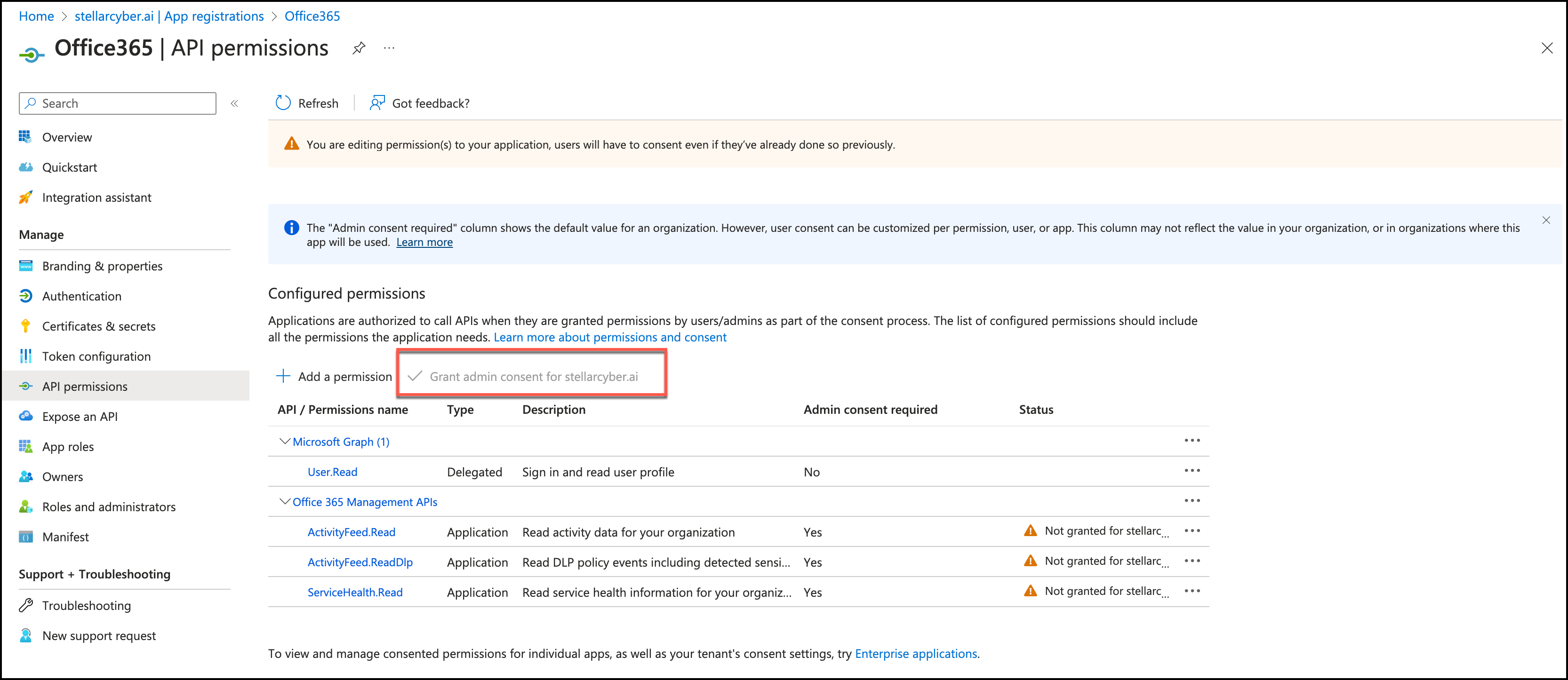 15. If you are the Office 365 super admin, grant the permissions. Select the checkmark to Grant admin consent for <account name>.