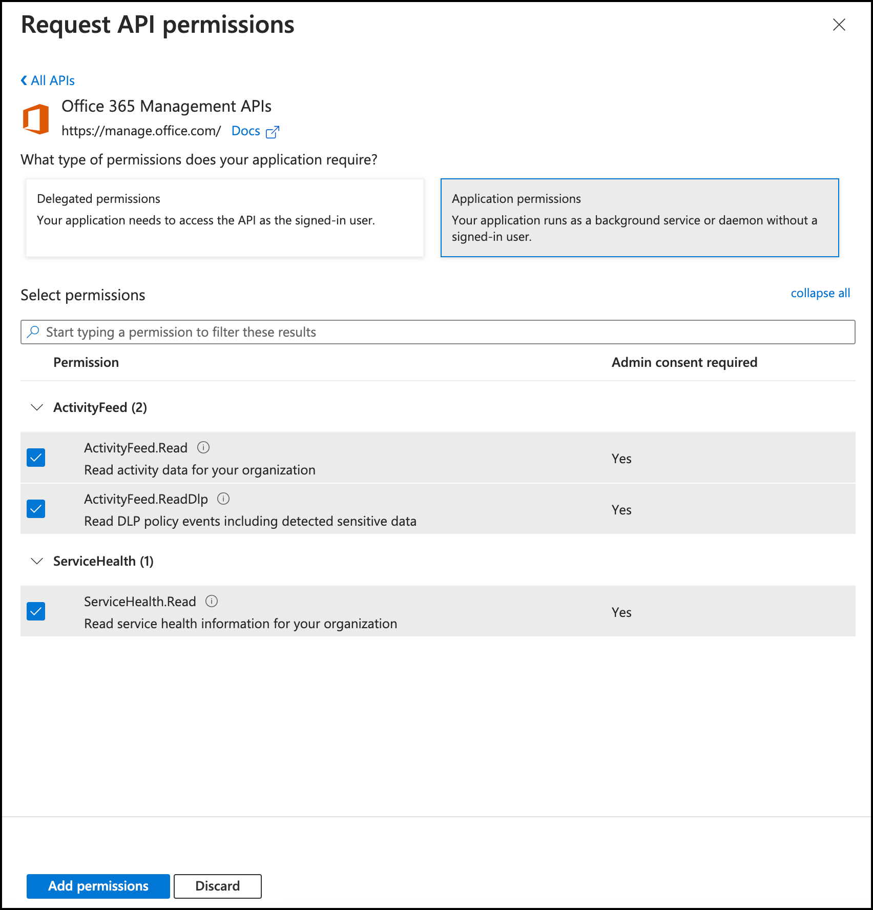 11. Select Office 365 Management APIs.