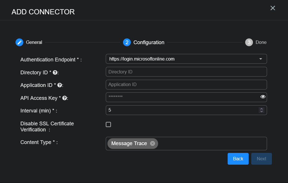 Choose the Content Type you would like to collect. The logs for Message Trace are supported.