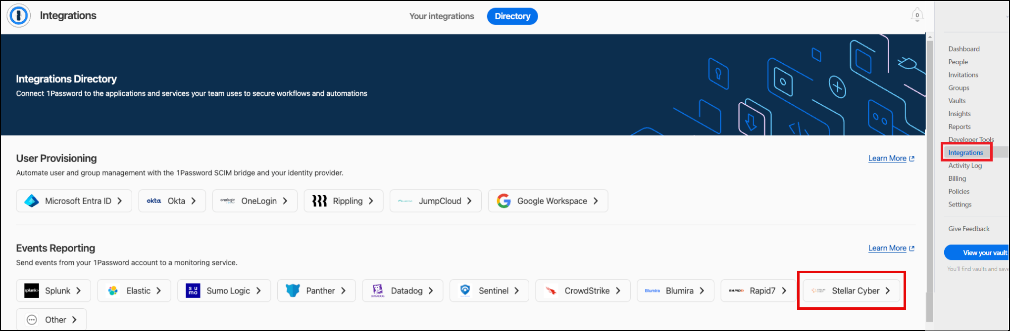 2. Select Integrations and under Events Reporting, select Stellar Cyber.