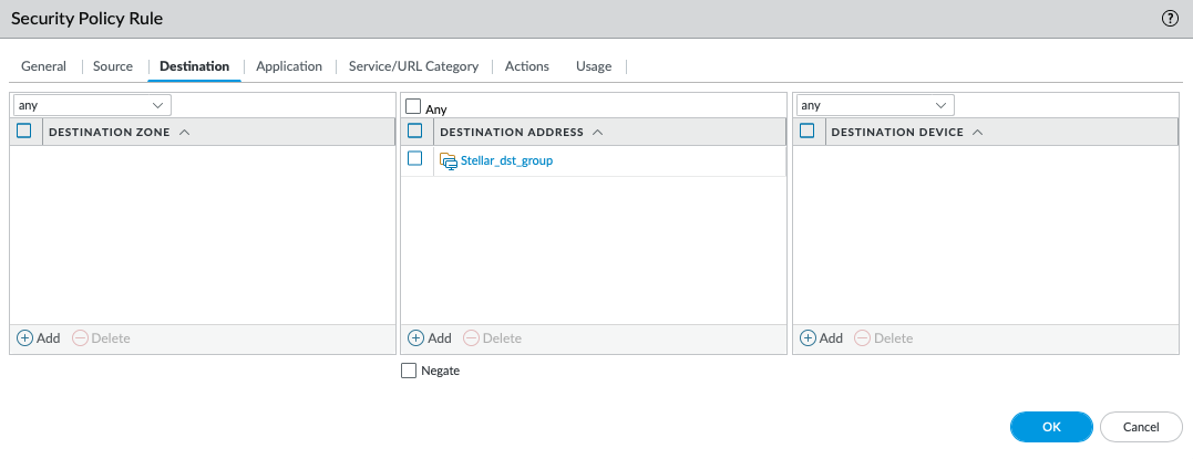 Create an address group called Stellar_dst_group. You must include at least one IP address.