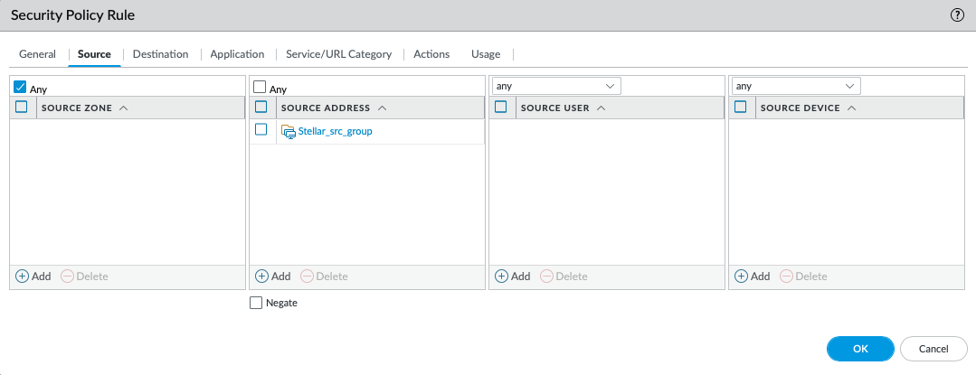 Create an address group called Stellar_src_group. You must include at least one IP address.