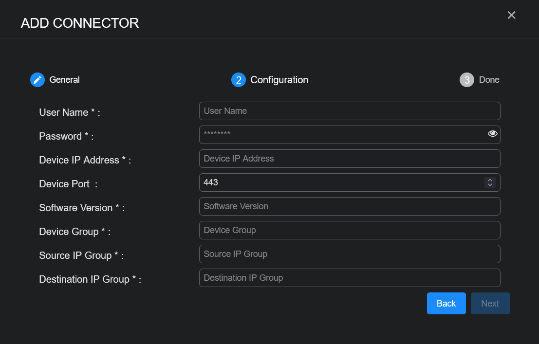 User Name, Password, Device IP Address, Software Version, Device Group, Source IP Group, and Destination IP Group