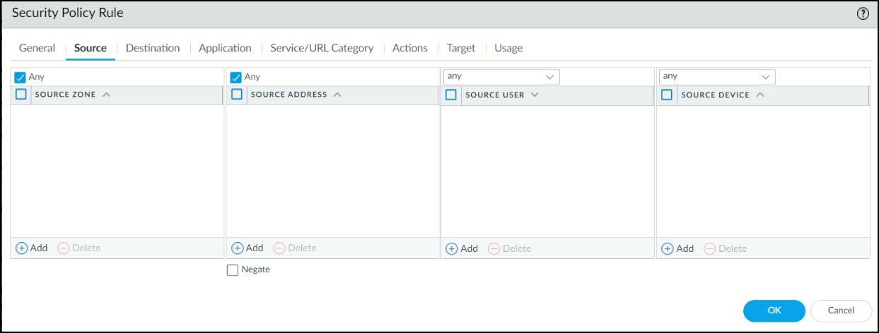 Under the Source tab, select Any and then add the source address group. In this example, it is Stellar_Src.