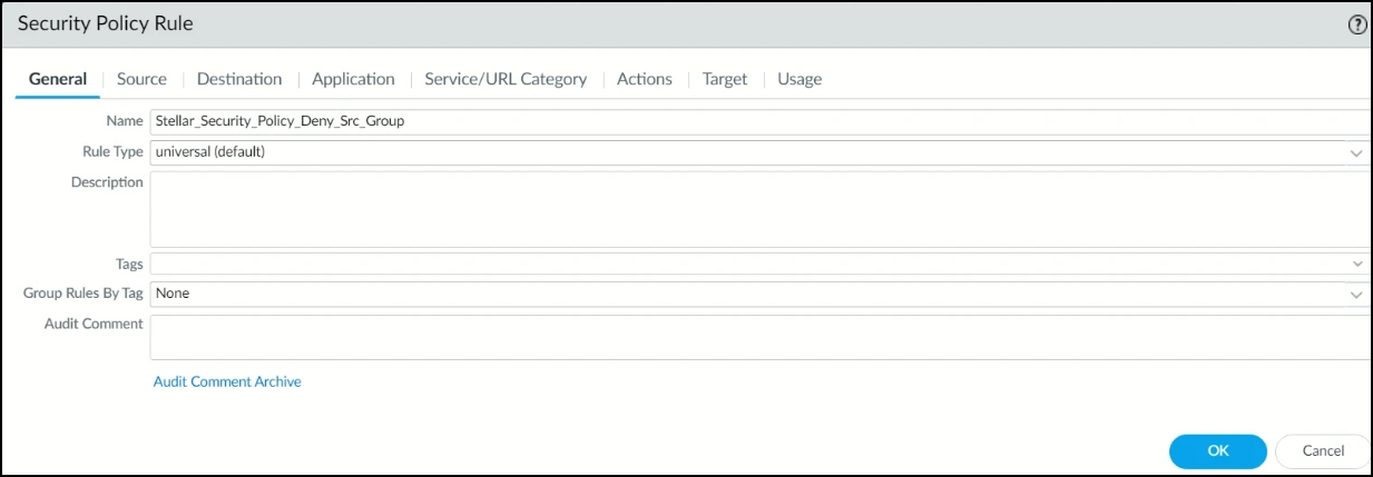 In the Security Policy Rule screen, under the General tab, enter the Name of the policy. In this example, it is Stellar_Security_Policy_Deny_Src_Group.