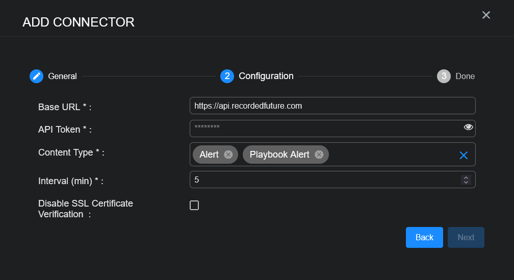 Enter the Base URL you noted above in Obtaining Recorded Future Credentials.