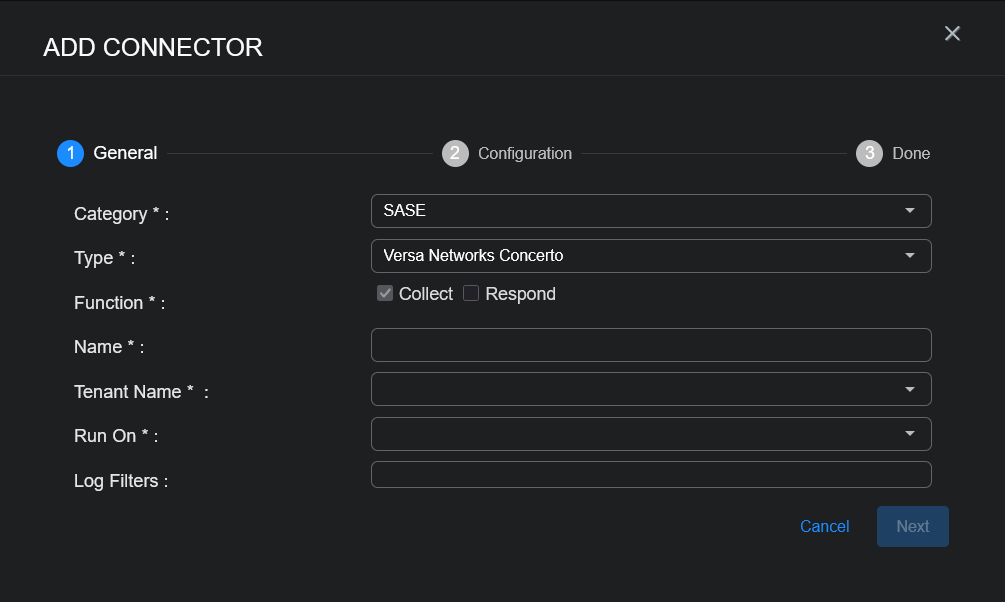 To add a Versa Networks Concerto connector in Stellar Cyber: