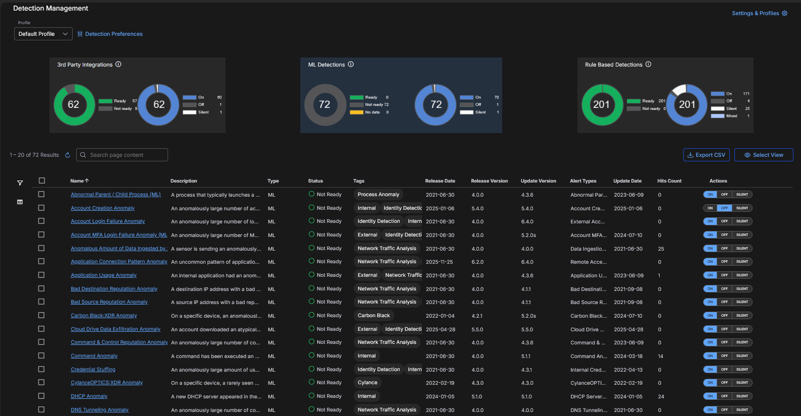 • Actions—Actions for 3rd Party Integrations, ML Detections and Rule Based Detections to toggle an alert type ON, OFF, or SILENT.