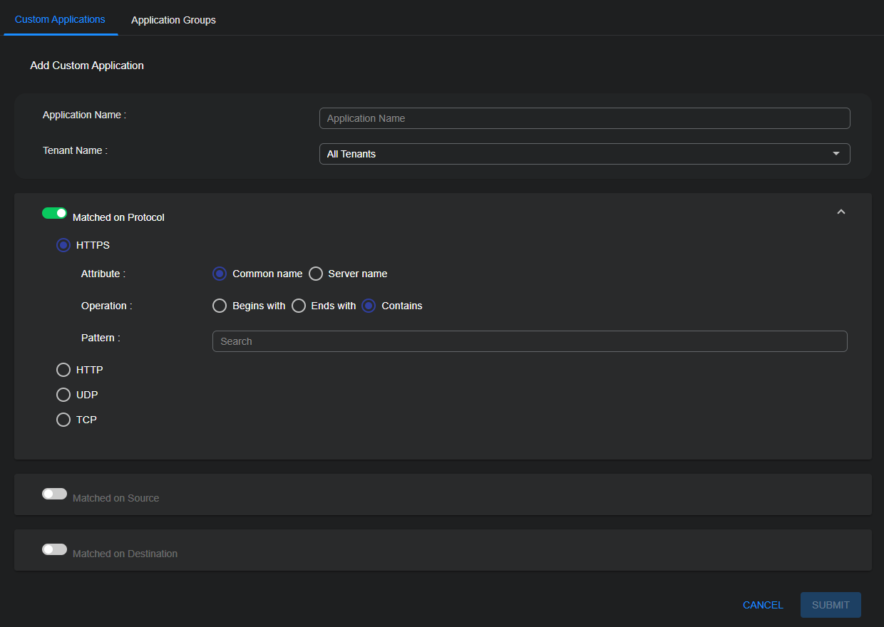 The Matched on Source and Matched on Destination options are not available when Matched on Protocol is set to HTTP or HTTPS.