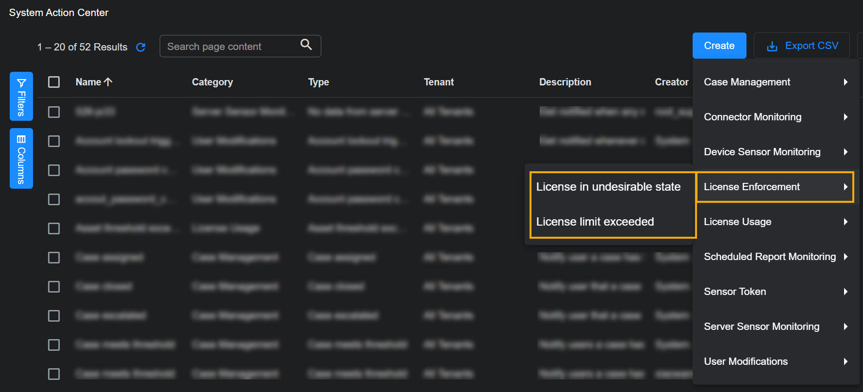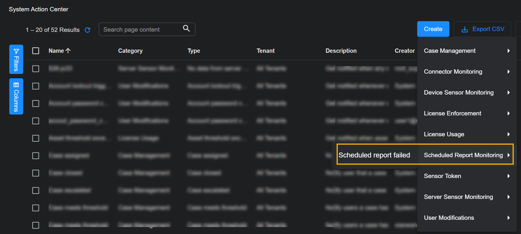 Click the Create button at the top of the System Action Center and select Scheduled Report Monitoring | Scheduled report failed from the dropdown that appears.