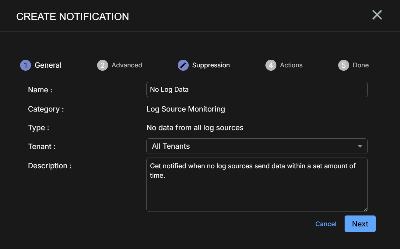 Monitors all sources globally but suppresses excluded log sources. The dropdown includes all log sources available to the tenancy selected in the previous step.