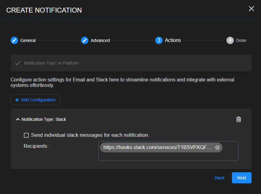 in the main toolbar. You can also configure notifications with both email and Slack actions to send messages to specified recipients, including both those defined in the System | Recipients page and those you specify manually on demand.