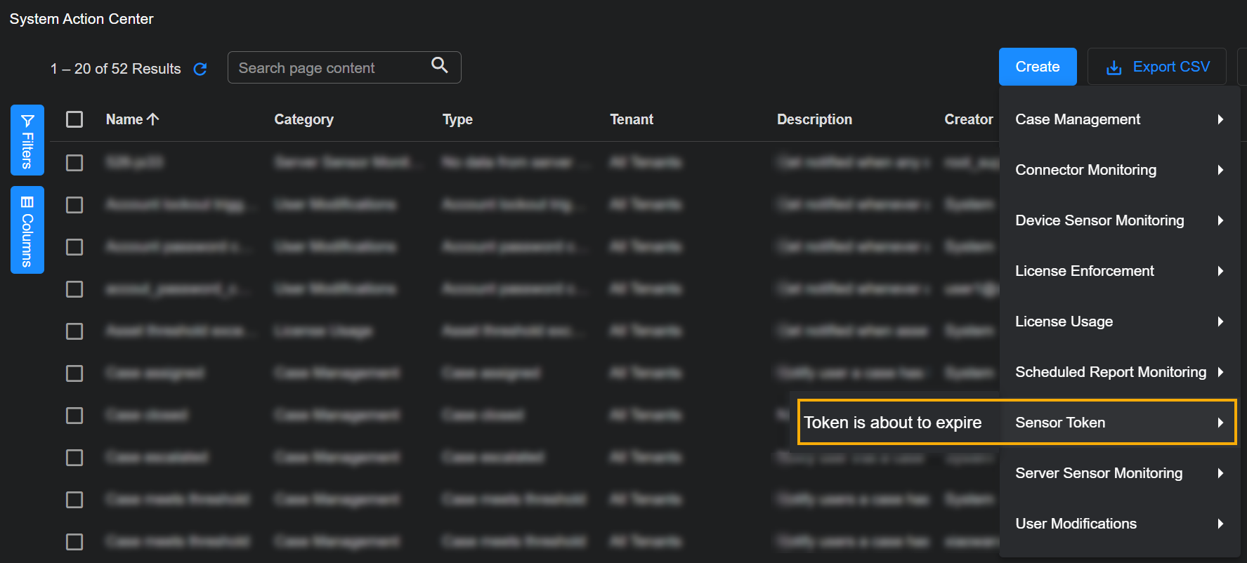 Click the Create button at the top of the System Action Center and select Sensor Token from the dropdown that appears.