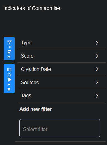 You can export Selected Columns or All Columns to a maximum of 10,000 IoCs. If there are more than 10,000, use filters and sort to select the 10,000 you want to export.