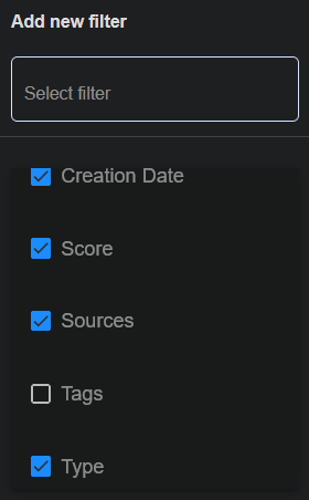 If a defined filter is unselected, you can click the search box under Add new filter to select a filter from the dropdown.