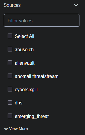 Sources—sources of the IoC, such as etpro, alienvault, or emerging_threat (an IoC could be ingested from multiple sources)