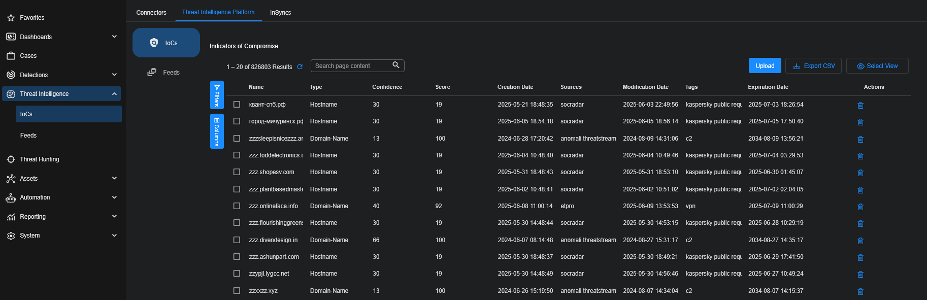 The IoCs tab displays all the latest IoCs that are present in storage, along with data associated with each IoC, such as expiration date, source, and confidence score.
