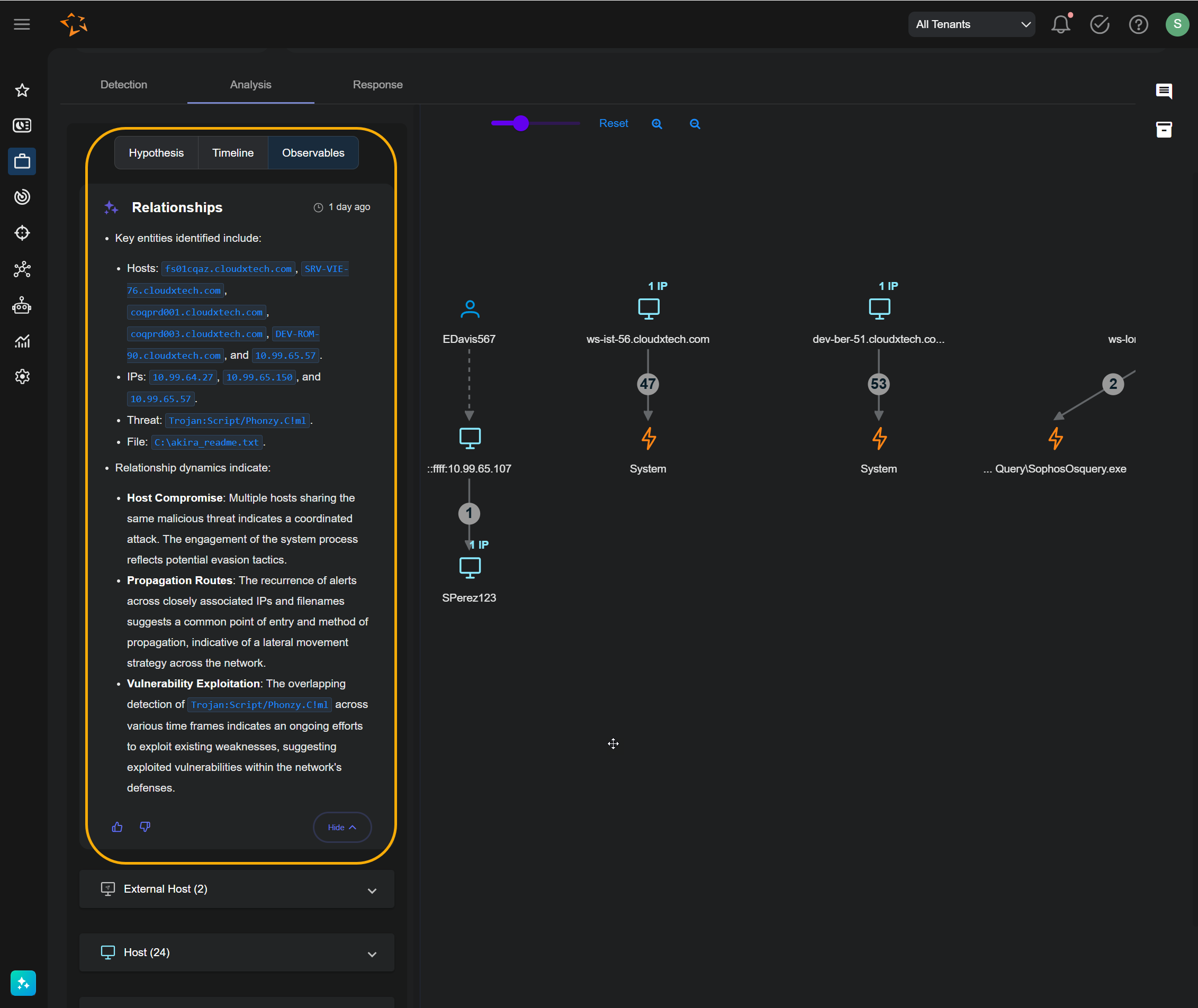 If you have AI Case Analysis enabled as part of an Early Access Program, the Observables panel includes an AI-generated summary of key entities for the case and the relationship dynamics between them, as well as a Hypothesis tab. Refer to Automated Hypotheses and Summaries in the Analysis Tab for details.