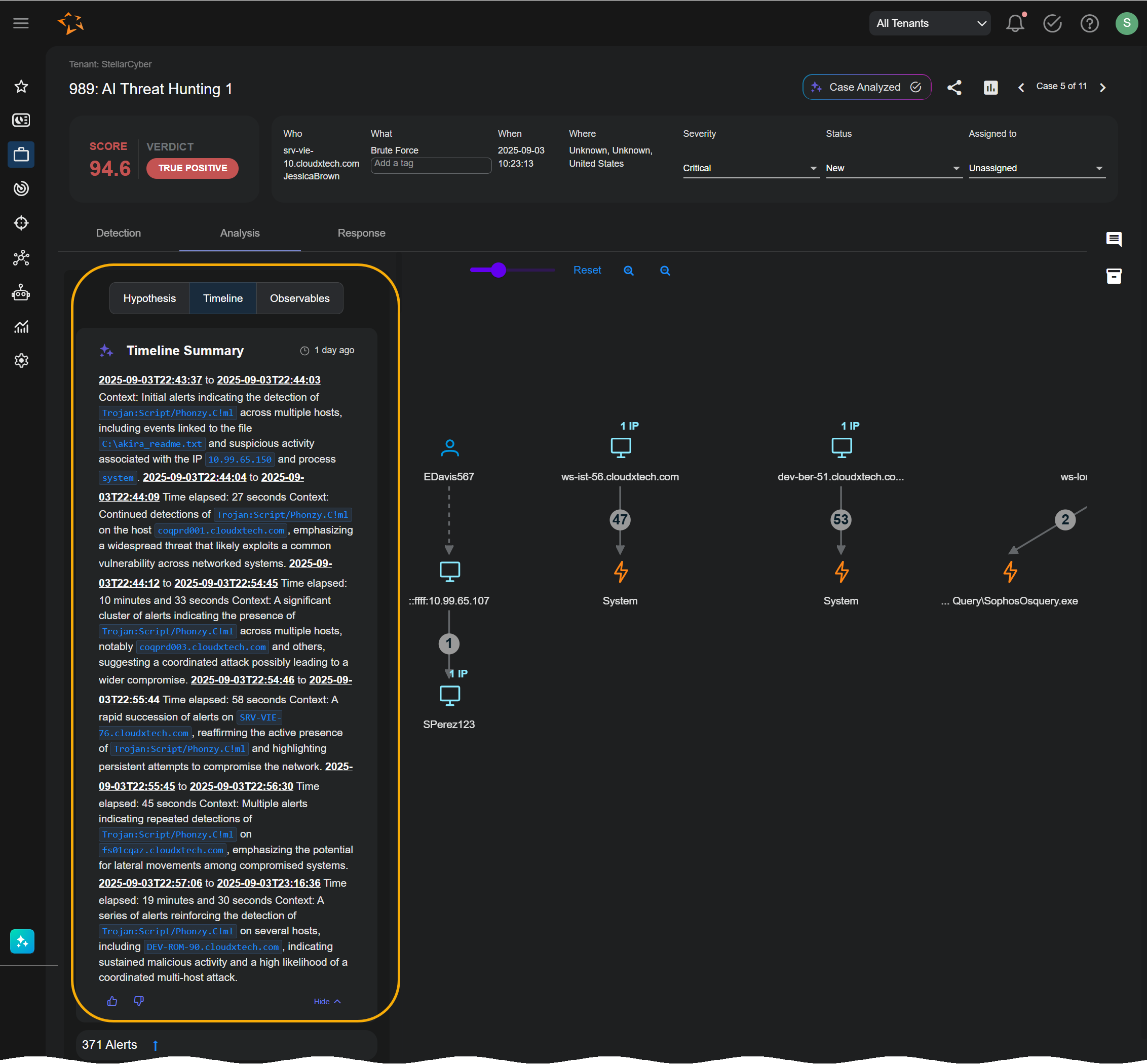Timeline panel – The existing Timeline panel is augmented with an AI-generated summary that reconstructs the attack in chronological order, step by step, with plain-language context for each stage. This helps you validate the progression of events and identify when compromise began.